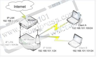 Pada dasarnya setting AP dengan AP Router yaitu sama, cuma saat konfigurasinya pada bagian peng-alamatan IP menjadi terbalik. IP LAN berfungsi sebagai IPWAN, sedangkan IP WAN berfungsi sebagai IP LAN atau IP pada Ethernet. Berfungsi sebagai Router atau sebagai penghubung dan penerus antara dua atau lebih jaringan yang memiliki alamat IP tertentu dan berbeda-beda. Dengan kata lain penghubung antara Network yang satu dengan ang lainnya. Karena pada penerapannya sebagai AP Router biasanya terhubung dengan router-router lainnya, atau kebanyakan digunakan untuk menyambungkan dari modem ke client-client yang berbeda IP subnet-nya. Kita bisa lihat pada gambar berikut untuk lebih jelasnya mengenai sistem kerja router.